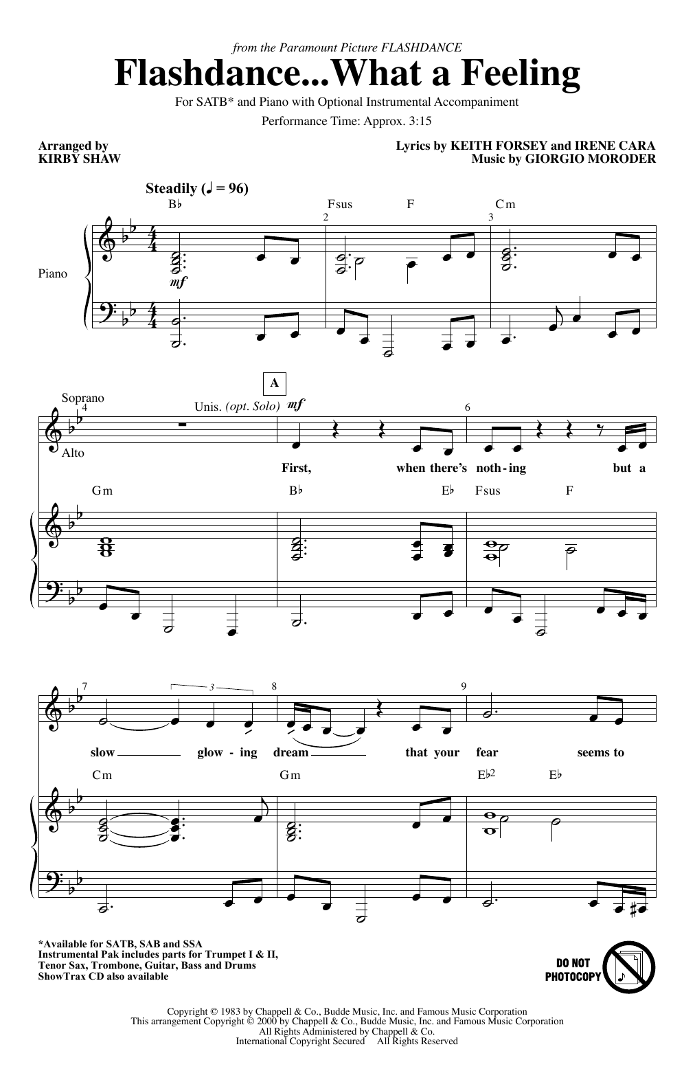Download or print Irene Cara Flashdance...What A Feeling (from Flashdance) (arr. Kirby Shaw) sheet music, chords and digital score arranged for SSA Choir. This Rock score includes 9 page(s).