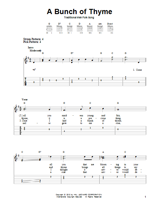 Download or print Traditional Irish Folksong A Bunch Of Thyme sheet music, chords and digital score arranged for Easy Guitar Tab. This Folk score includes 2 page(s).