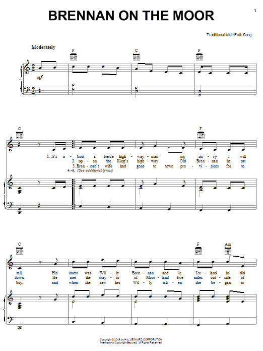 Download or print Irish Folksong Brennan On The Moor sheet music, chords and digital score arranged for Piano, Vocal & Guitar Chords (Right-Hand Melody). This Folk score includes 2 page(s).