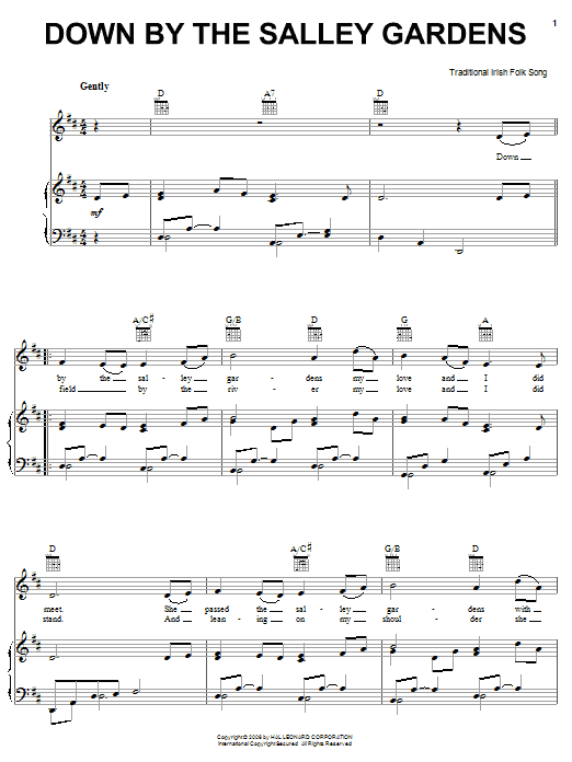 Download or print Irish Folksong Down By The Sally Gardens sheet music, chords and digital score arranged for Piano, Vocal & Guitar Chords (Right-Hand Melody). This Folk score includes 2 page(s).