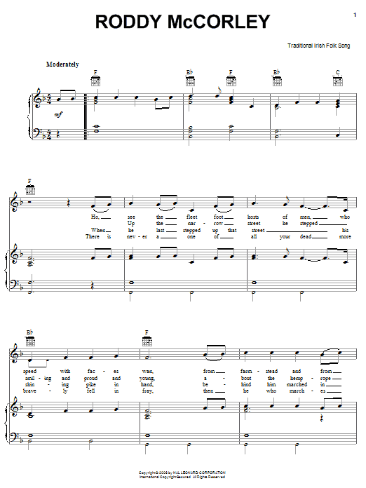 Download or print Irish Folksong Roddy McCorley sheet music, chords and digital score arranged for Piano, Vocal & Guitar Chords (Right-Hand Melody). This Folk score includes 2 page(s).
