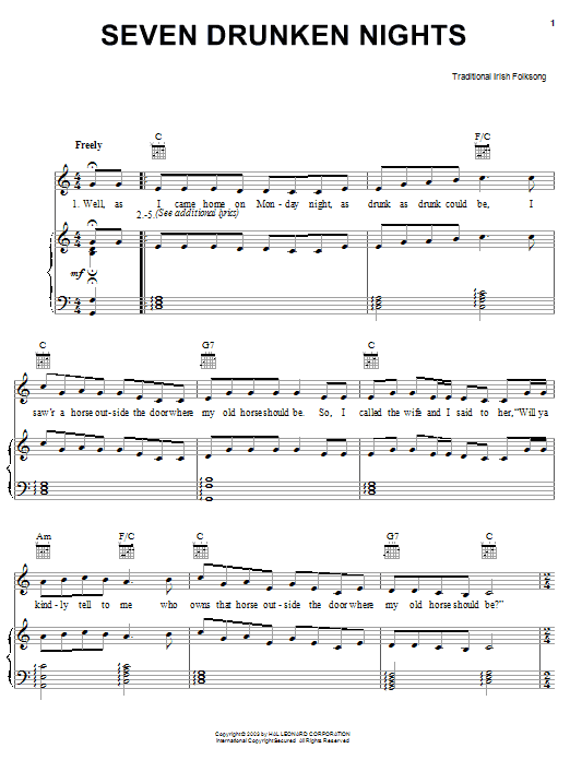 Download or print Irish Folksong Seven Drunken Nights sheet music, chords and digital score arranged for Piano, Vocal & Guitar Chords (Right-Hand Melody). This Folk score includes 3 page(s).