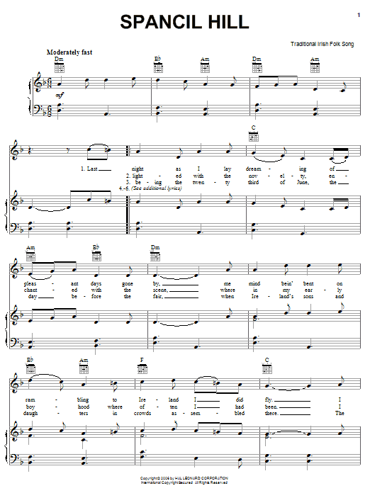 Download or print Irish Folksong Spancil Hill sheet music, chords and digital score arranged for Piano, Vocal & Guitar Chords (Right-Hand Melody). This Folk score includes 2 page(s).