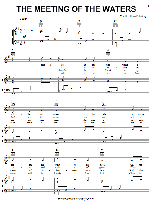 Download or print Irish Folksong The Meeting Of The Waters sheet music, chords and digital score arranged for Piano, Vocal & Guitar Chords (Right-Hand Melody). This Folk score includes 2 page(s).