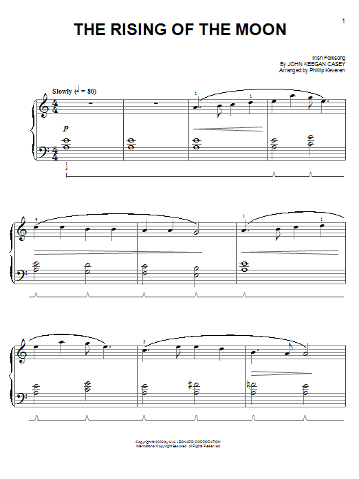 Download or print Irish Folksong The Rising Of The Moon (arr. Phillip Keveren) sheet music, chords and digital score arranged for Easy Piano. This Folk score includes 3 page(s).