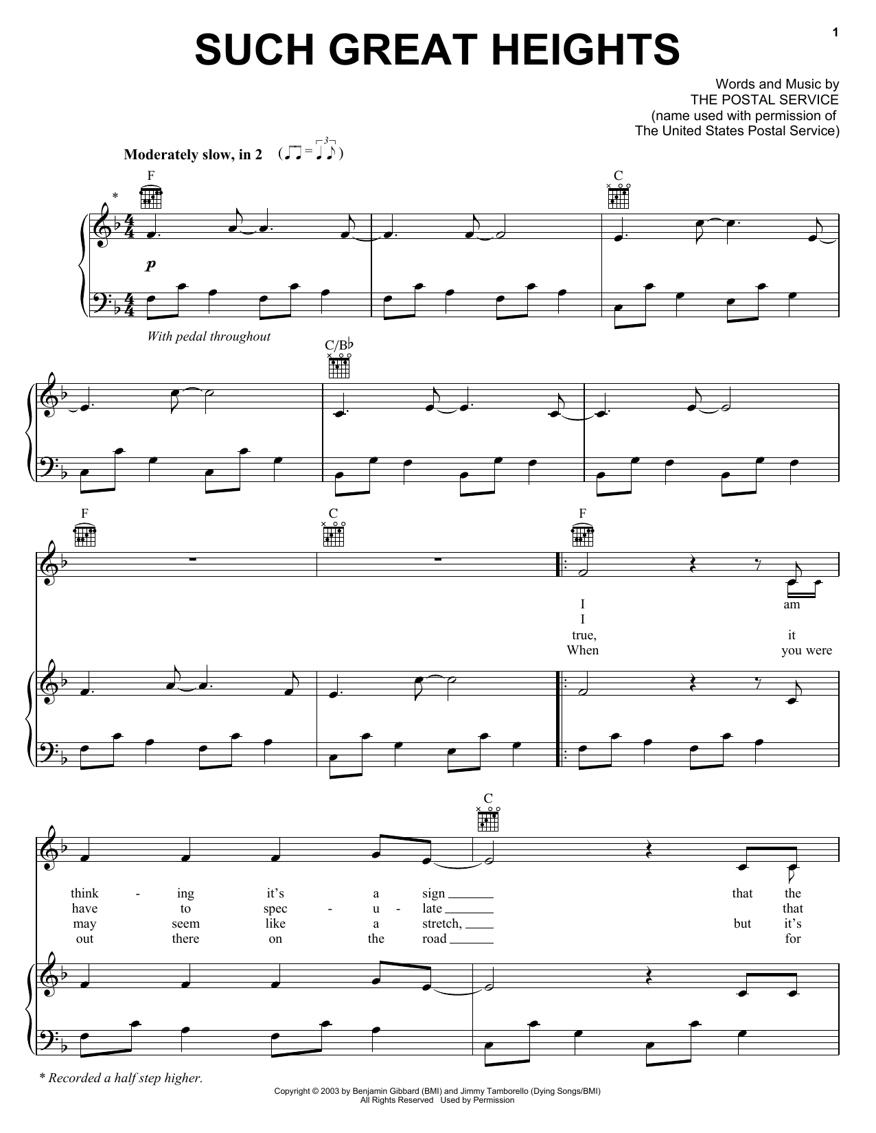 Download or print Iron And Wine Such Great Heights sheet music, chords and digital score arranged for Piano, Vocal & Guitar Chords (Right-Hand Melody). This Pop score includes 5 page(s).