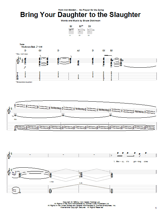 Download or print Iron Maiden Bring Your Daughter To The Slaughter sheet music, chords and digital score arranged for Guitar Tab. This Metal score includes 13 page(s).