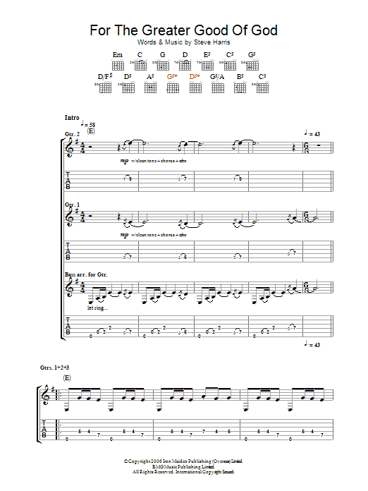 Download or print Iron Maiden For The Greater Good Of God sheet music, chords and digital score arranged for Bass Guitar Tab. This Metal score includes 13 page(s).
