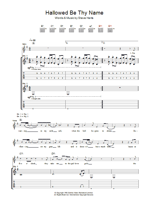 Download or print Iron Maiden Hallowed Be Thy Name sheet music, chords and digital score arranged for Guitar Tab (Single Guitar). This Rock score includes 16 page(s).