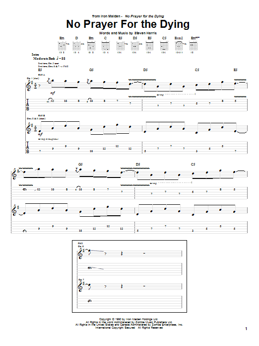 Download or print Iron Maiden No Prayer For The Dying sheet music, chords and digital score arranged for Guitar Tab. This Metal score includes 13 page(s).