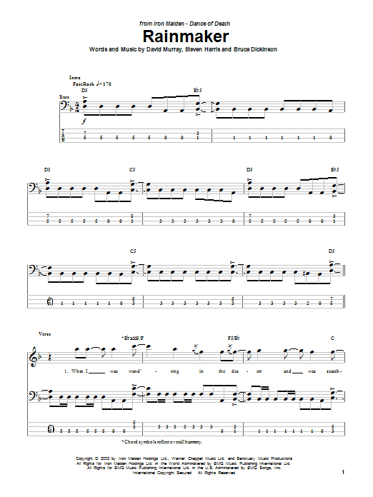 Download or print Iron Maiden Rainmaker sheet music, chords and digital score arranged for Bass Guitar Tab. This Metal score includes 7 page(s).