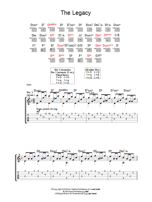 Download or print Iron Maiden The Legacy sheet music, chords and digital score arranged for Guitar Tab. This Metal score includes 15 page(s).