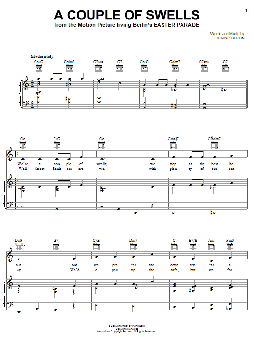 Download or print Irving Berlin A Couple Of Swells sheet music, chords and digital score arranged for Piano, Vocal & Guitar Chords (Right-Hand Melody). This Pop score includes 5 page(s).