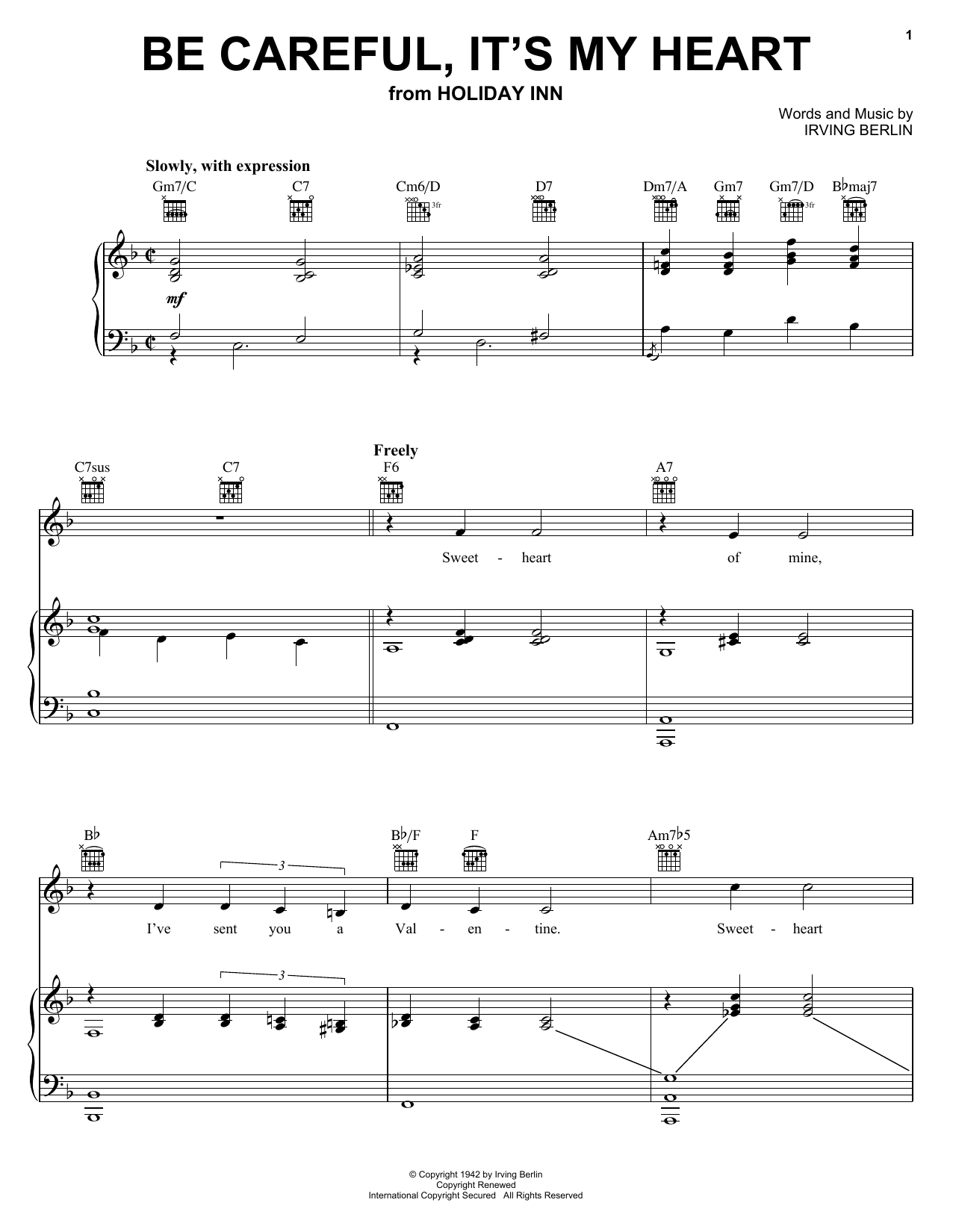 Download or print Irving Berlin Be Careful, It's My Heart sheet music, chords and digital score arranged for Real Book – Melody & Chords – C Instruments. This Jazz score includes 1 page(s).