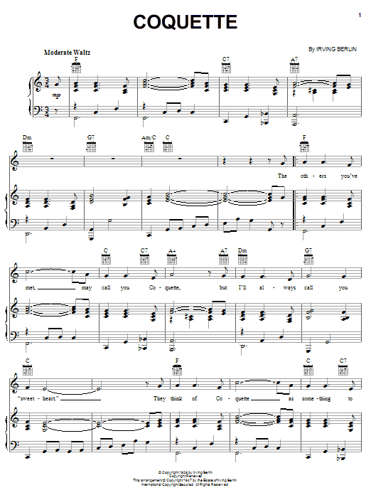 Download or print Irving Berlin Coquette sheet music, chords and digital score arranged for Piano, Vocal & Guitar Chords (Right-Hand Melody). This Jazz score includes 2 page(s).