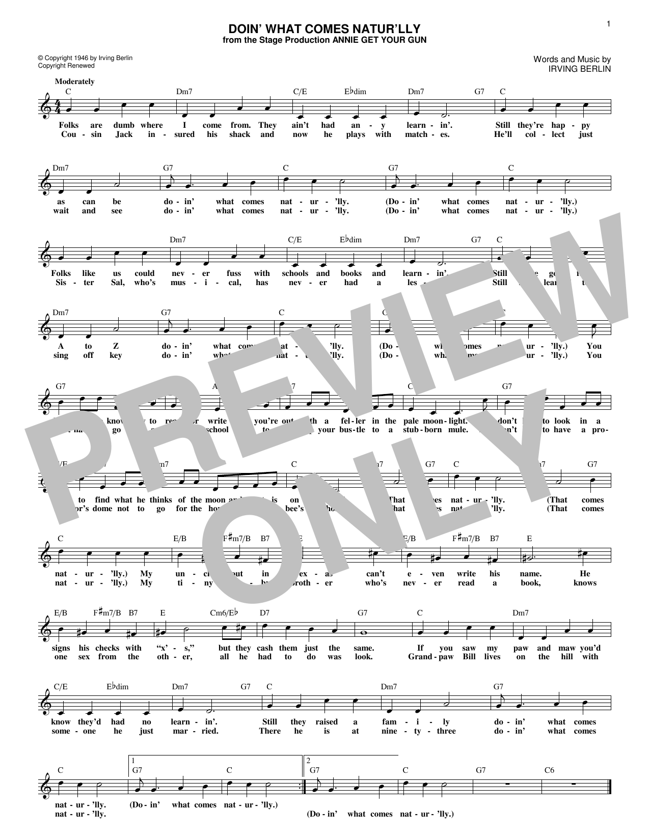 Download or print Irving Berlin Doin' What Comes Natur'lly sheet music, chords and digital score arranged for Lead Sheet / Fake Book. This Standards score includes 1 page(s).