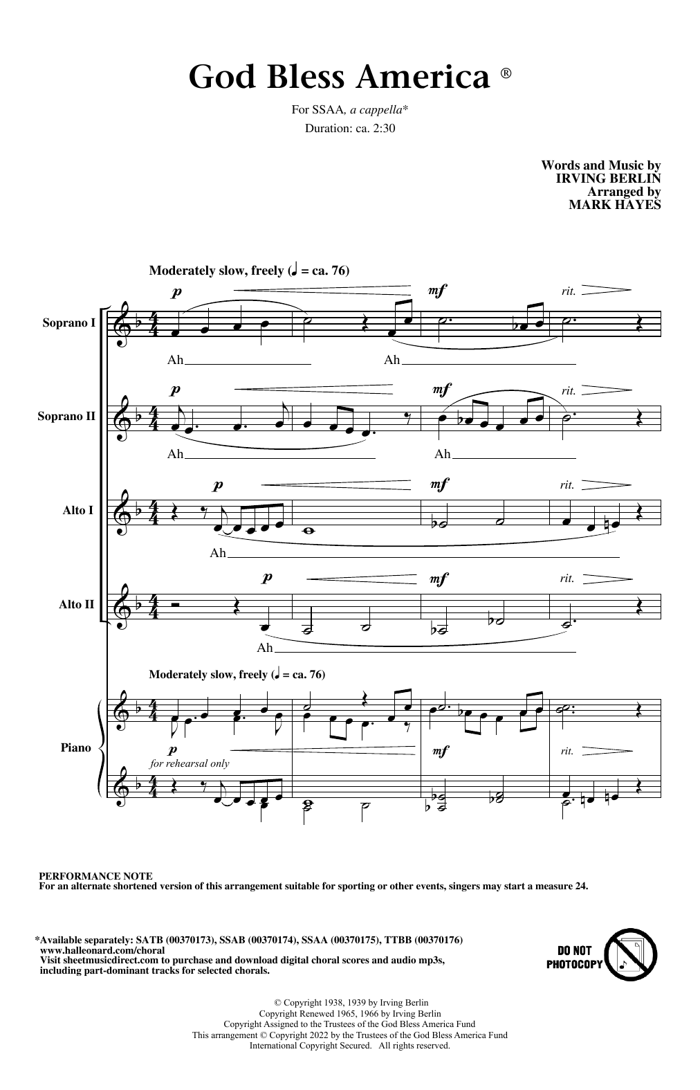 Download or print Irving Berlin God Bless America (arr. Mark Hayes) sheet music, chords and digital score arranged for TTBB Choir. This Patriotic score includes 9 page(s).