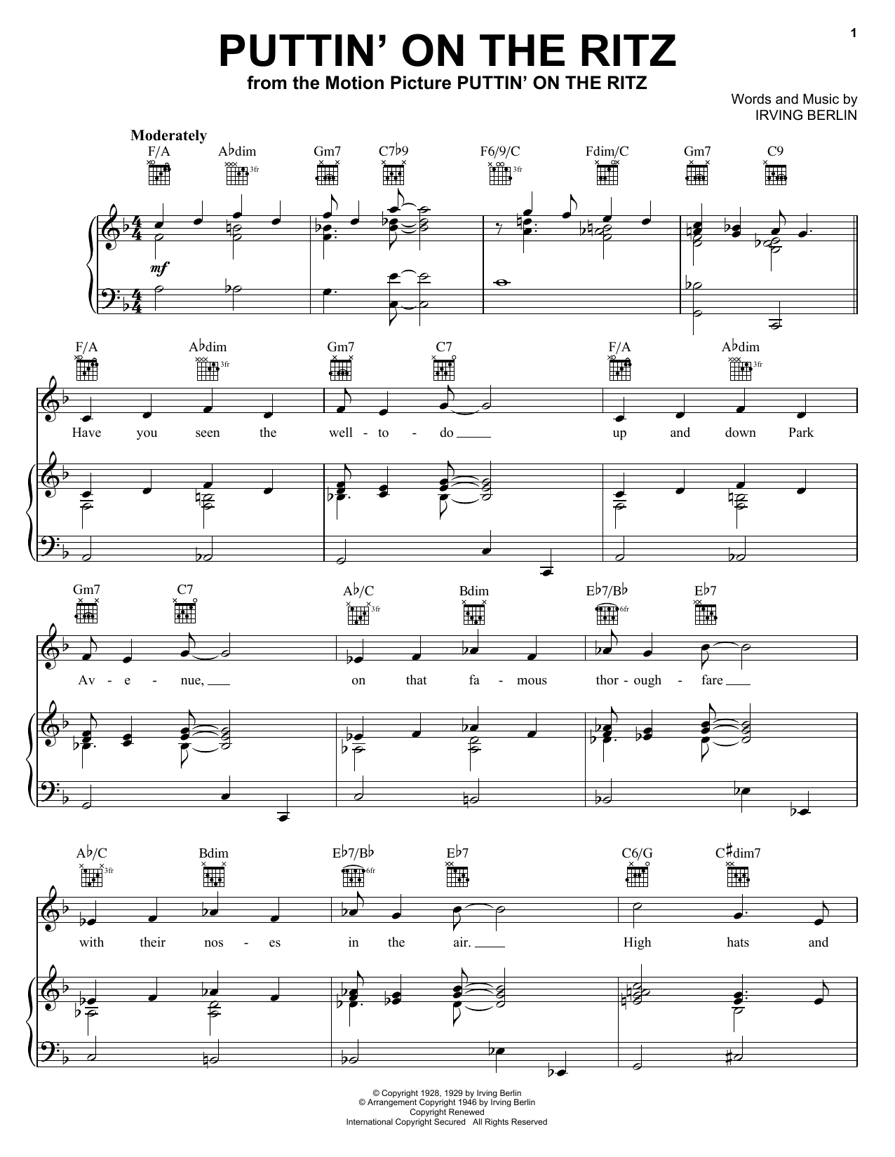 Download or print Irving Berlin Puttin' On The Ritz sheet music, chords and digital score arranged for Super Easy Piano. This Jazz score includes 2 page(s).