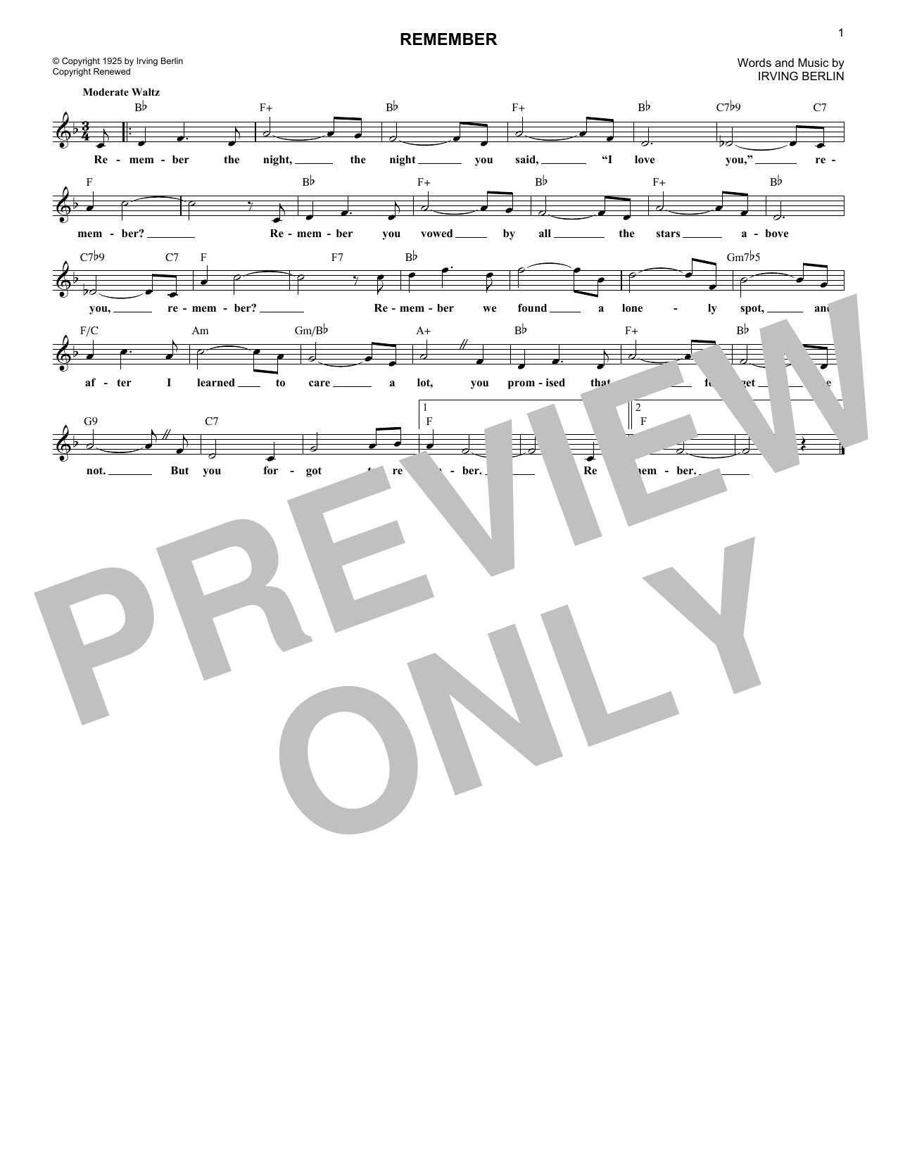 Download or print Irving Berlin Remember sheet music, chords and digital score arranged for Lead Sheet / Fake Book. This Jazz score includes 1 page(s).