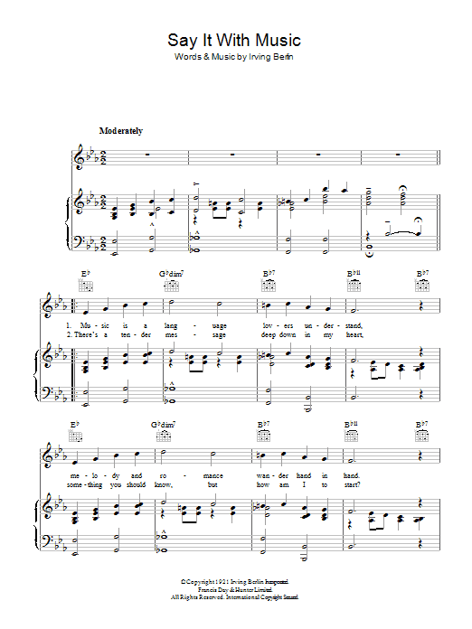Download or print Irving Berlin Say It With Music sheet music, chords and digital score arranged for Piano, Vocal & Guitar Chords (Right-Hand Melody). This Inspirational score includes 4 page(s).