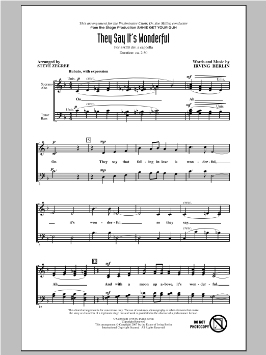 Download or print Steve Zegree They Say It's Wonderful sheet music, chords and digital score arranged for SATB Choir. This Standards score includes 6 page(s).