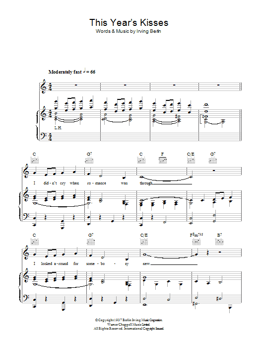 Download or print Irving Berlin This Year's Kisses sheet music, chords and digital score arranged for Real Book – Melody & Chords – C Instruments. This Jazz score includes 1 page(s).