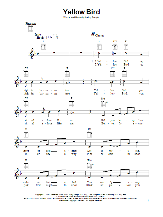 Download or print Irving Burgie Yellow Bird sheet music, chords and digital score arranged for Piano, Vocal & Guitar Chords (Right-Hand Melody). This Pop score includes 3 page(s).