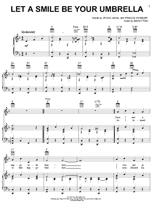 Download or print Irving Kahal Let A Smile Be Your Umbrella sheet music, chords and digital score arranged for Piano, Vocal & Guitar Chords (Right-Hand Melody). This Country score includes 4 page(s).