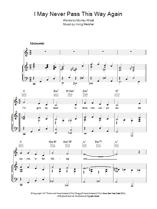 Download or print Irving Melsher I May Never Pass This Way Again sheet music, chords and digital score arranged for Piano, Vocal & Guitar Chords. This Standards score includes 3 page(s).