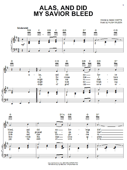 Download or print Isaac Watts Alas, And Did My Savior Bleed sheet music, chords and digital score arranged for Piano, Vocal & Guitar Chords (Right-Hand Melody). This Christian score includes 2 page(s).