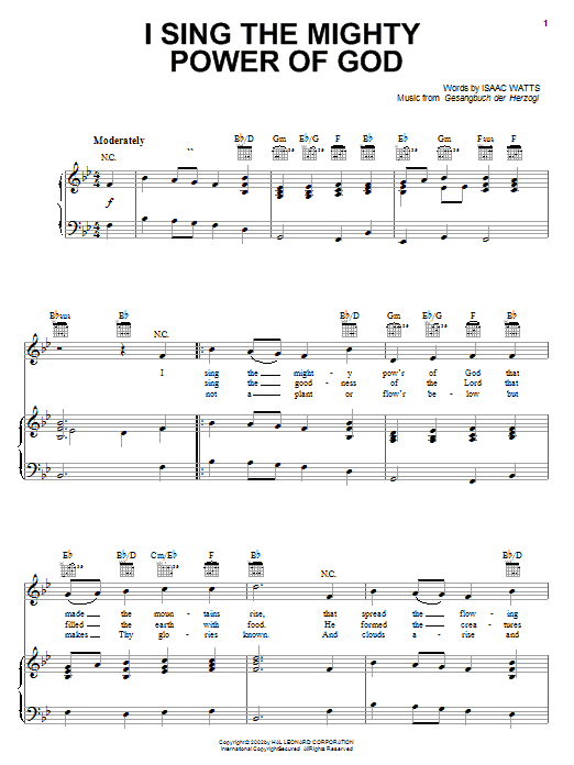 Download or print Isaac Watts I Sing The Mighty Power Of God sheet music, chords and digital score arranged for Piano, Vocal & Guitar Chords (Right-Hand Melody). This Christian score includes 2 page(s).