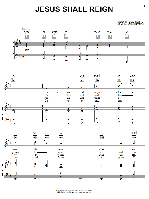 Download or print Isaac Watts Jesus Shall Reign (Where'er The Sun) sheet music, chords and digital score arranged for Piano, Vocal & Guitar Chords (Right-Hand Melody). This Inspirational score includes 2 page(s).