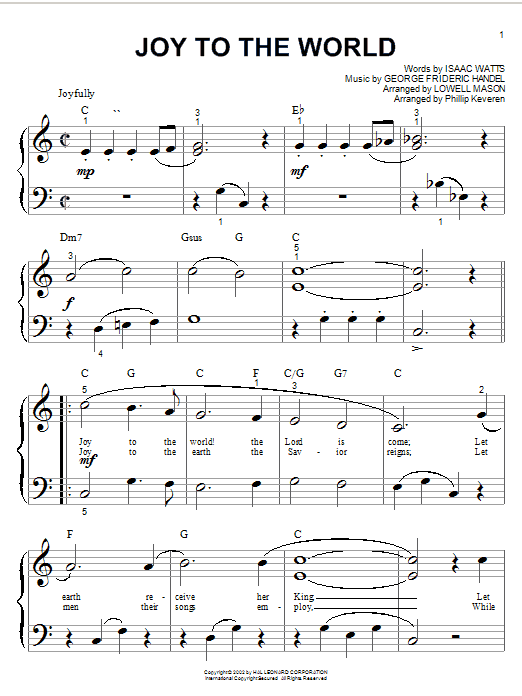 Download or print Isaac Watts Joy To The World (arr. Phillip Keveren) sheet music, chords and digital score arranged for Big Note Piano. This Christmas score includes 2 page(s).