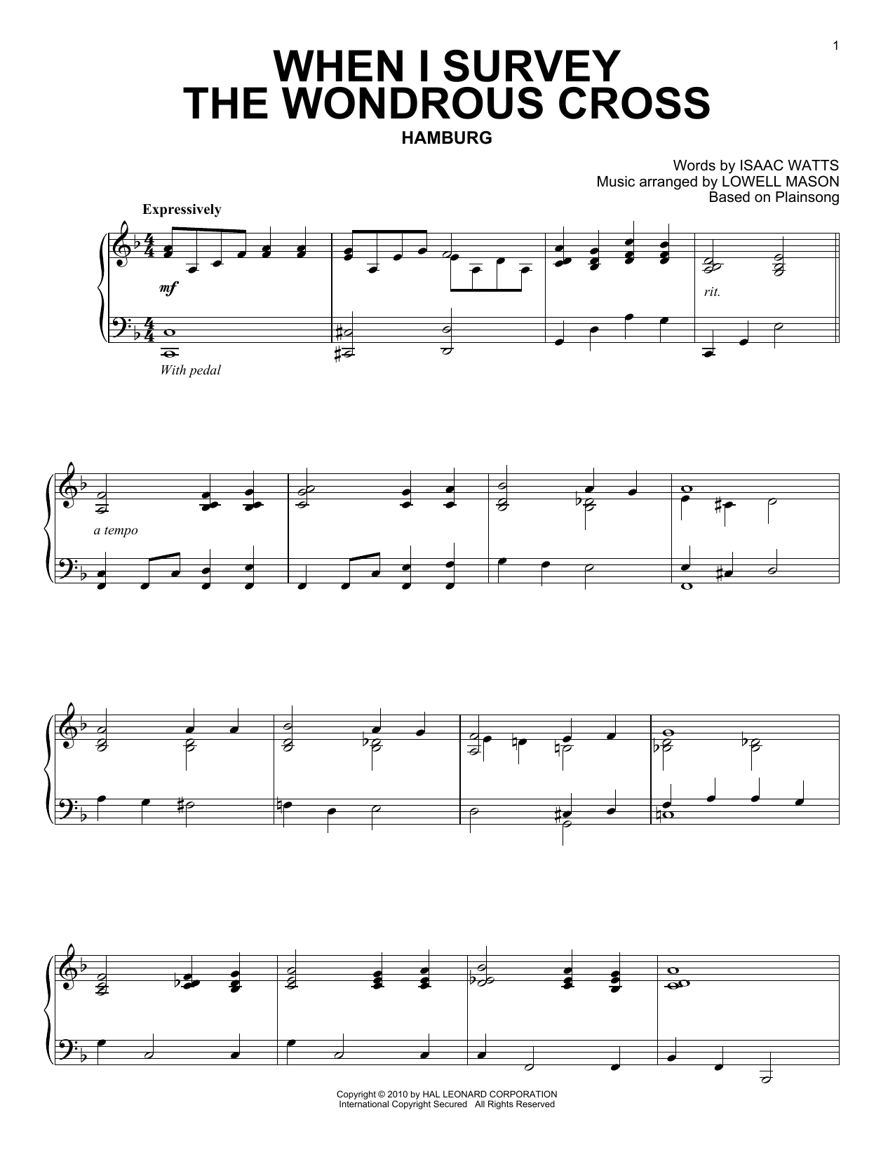 Download or print Isaac Watts When I Survey The Wondrous Cross sheet music, chords and digital score arranged for Piano Solo. This Hymn score includes 3 page(s).