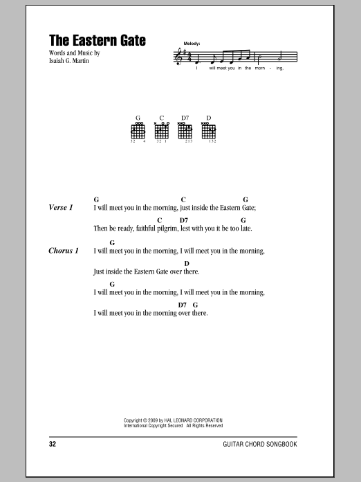 Download or print Isaiah G. Martin The Eastern Gate sheet music, chords and digital score arranged for Piano, Vocal & Guitar Chords (Right-Hand Melody). This Gospel score includes 2 page(s).