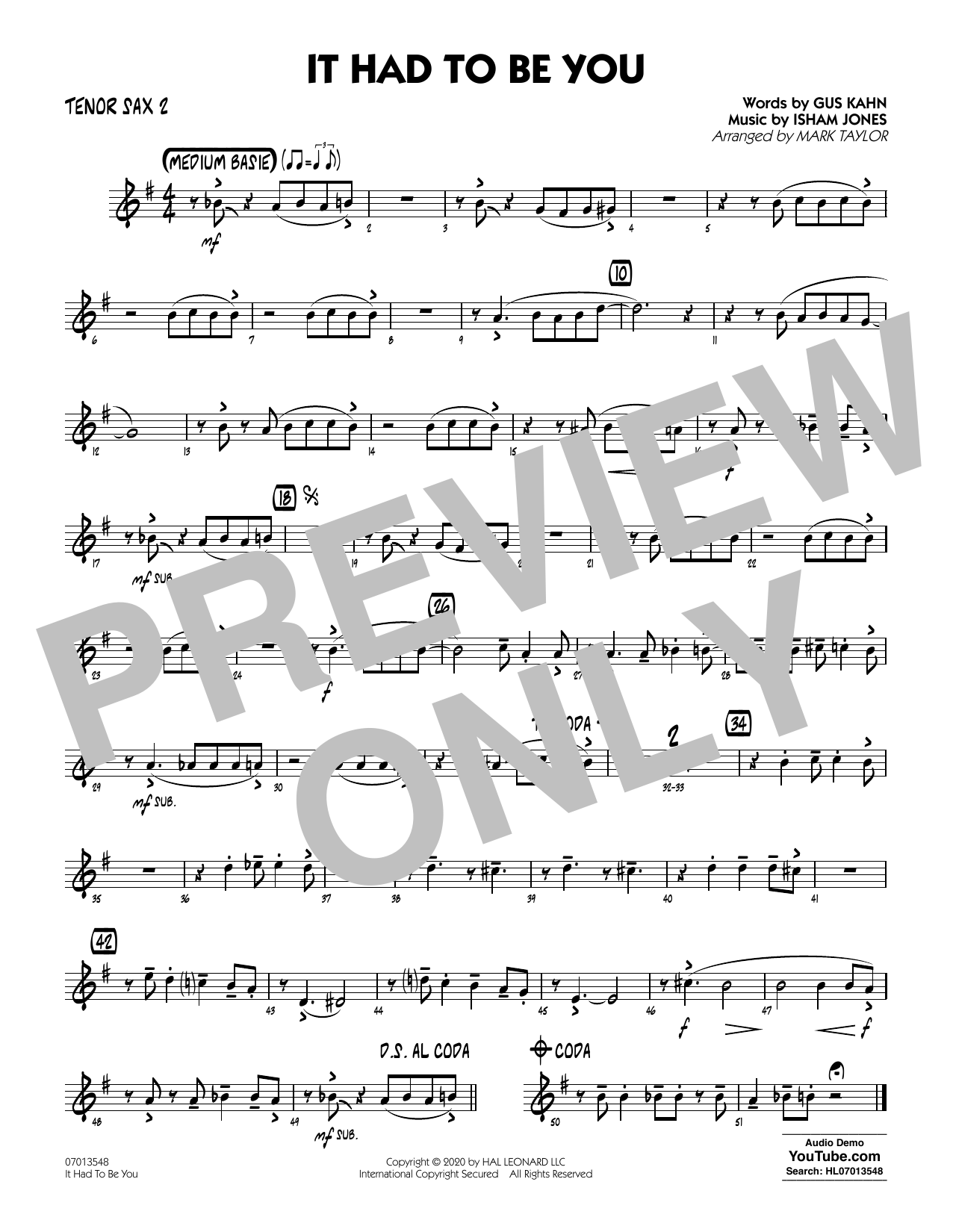 Download or print Isham Jones and Gus Kahn It Had to Be You (arr. Mark Taylor) - Tenor Sax 2 sheet music, chords and digital score arranged for Jazz Ensemble. This Jazz score includes 1 page(s).