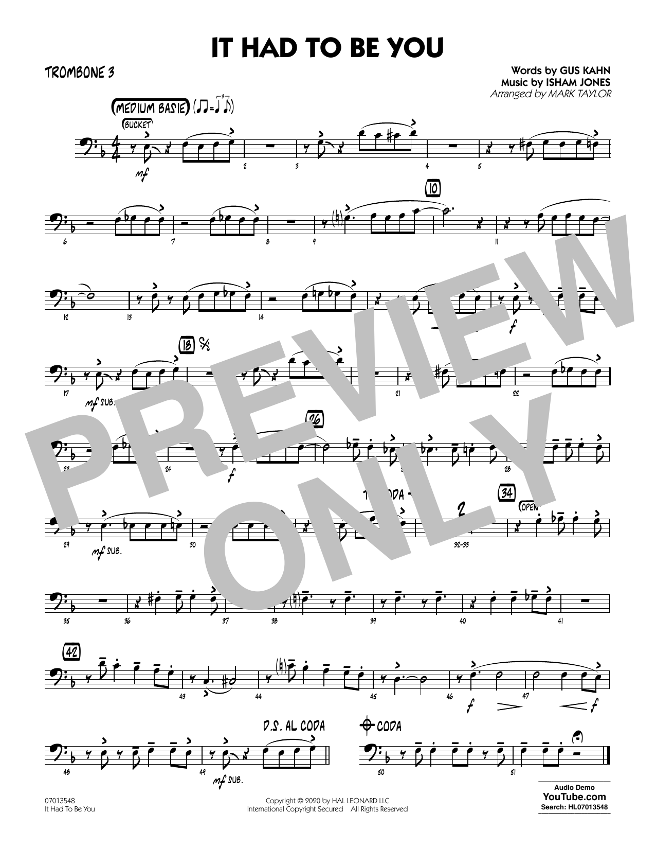Download or print Isham Jones and Gus Kahn It Had to Be You (arr. Mark Taylor) - Trombone 3 sheet music, chords and digital score arranged for Jazz Ensemble. This Jazz score includes 1 page(s).