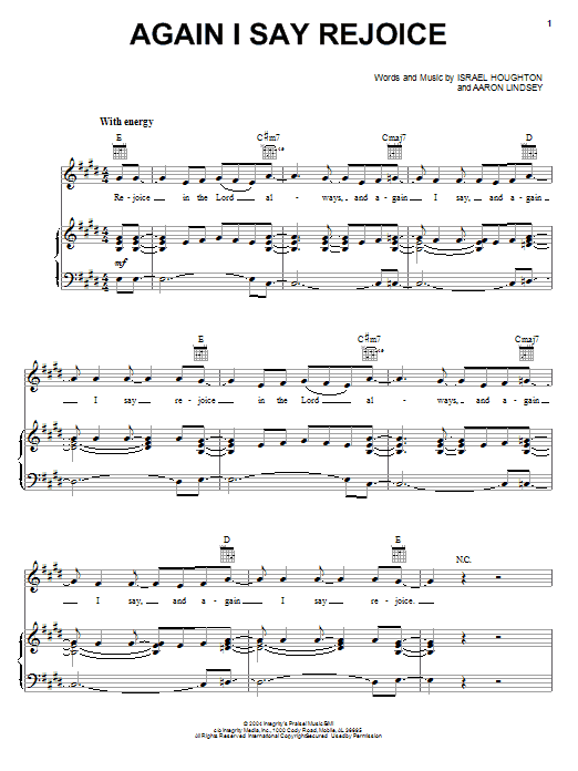 Download or print Israel Houghton Again I Say Rejoice sheet music, chords and digital score arranged for Piano, Vocal & Guitar Chords (Right-Hand Melody). This Christian score includes 10 page(s).