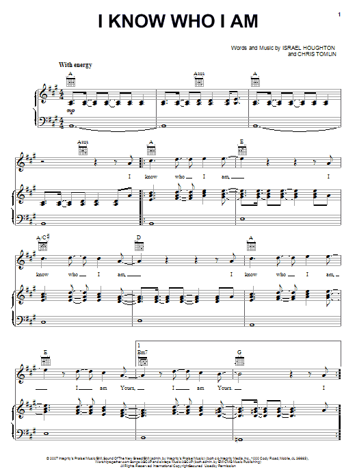 Download or print Israel Houghton I Know Who I Am sheet music, chords and digital score arranged for Piano, Vocal & Guitar Chords (Right-Hand Melody). This Christian score includes 10 page(s).