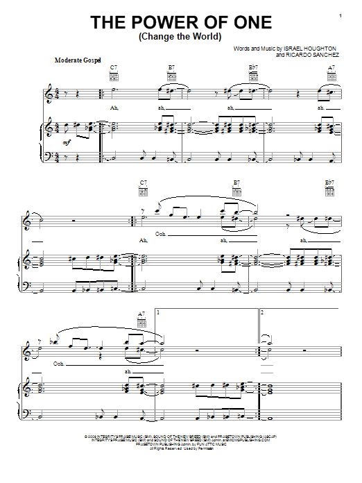 Download or print Israel Houghton The Power Of One (Change The World) sheet music, chords and digital score arranged for Piano, Vocal & Guitar Chords (Right-Hand Melody). This Pop score includes 10 page(s).