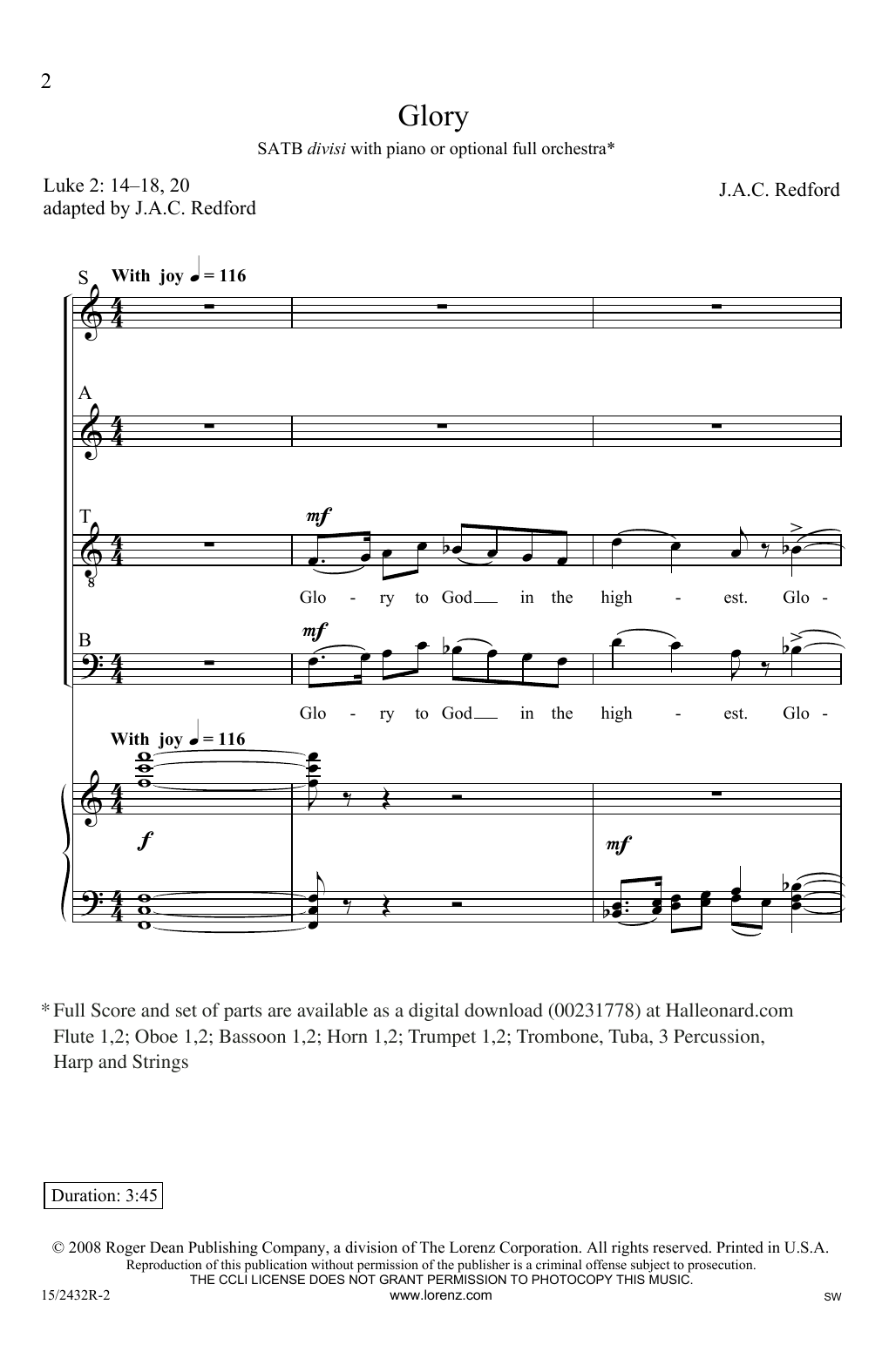 Download or print J.A.C. Redford Glory sheet music, chords and digital score arranged for SATB Choir. This Christmas score includes 23 page(s).