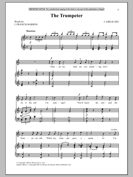 Download or print J. Airlie Dix The Trumpeter sheet music, chords and digital score arranged for Piano & Vocal. This Folk score includes 6 page(s).