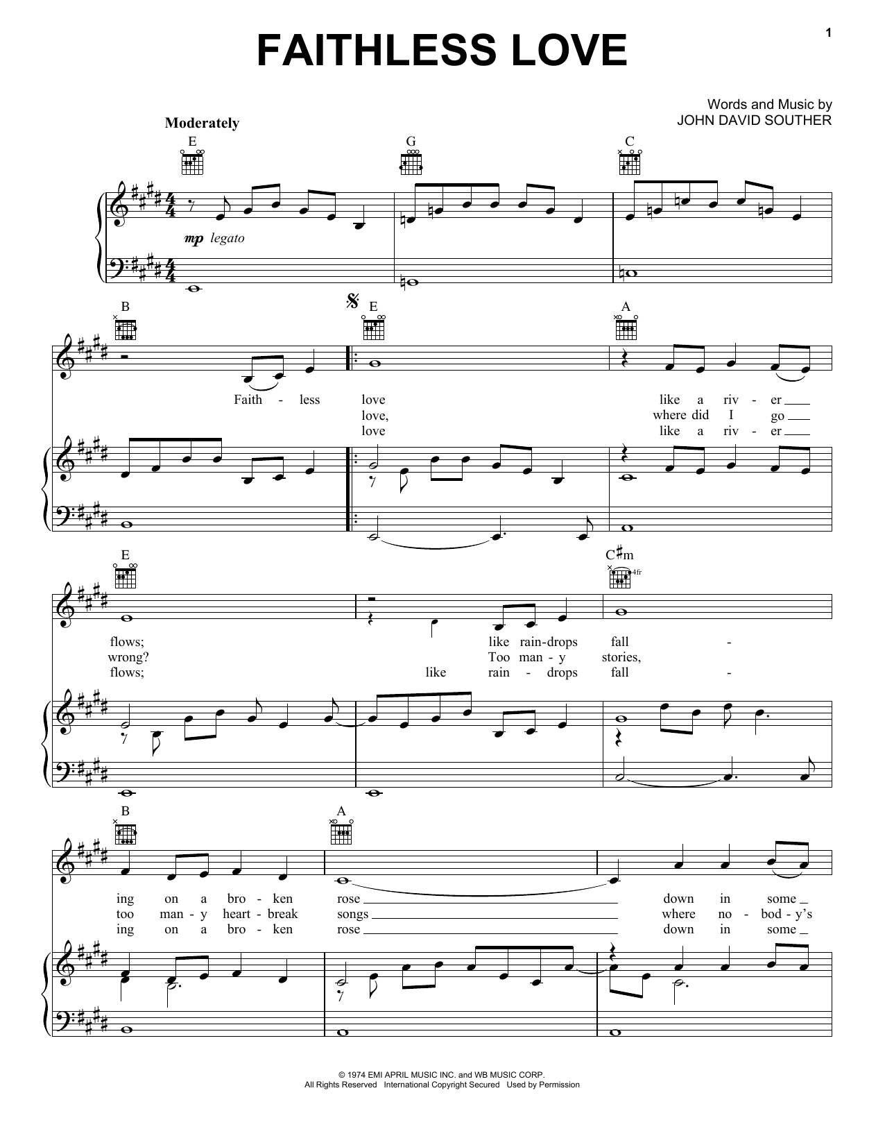 Download or print J.D. Souther Faithless Love sheet music, chords and digital score arranged for Piano, Vocal & Guitar Chords (Right-Hand Melody). This Country score includes 5 page(s).