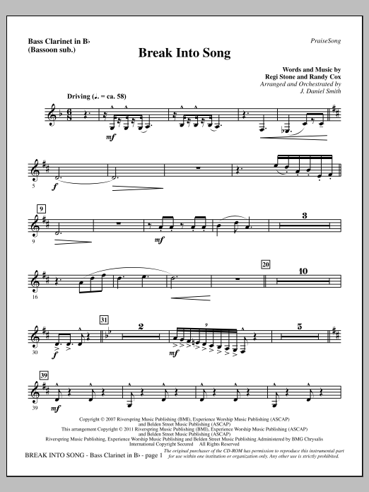 Download or print J. Daniel Smith Break Into Song - Bass Clarinet (sub. Bassoon) sheet music, chords and digital score arranged for Choir Instrumental Pak. This Contemporary score includes 2 page(s).