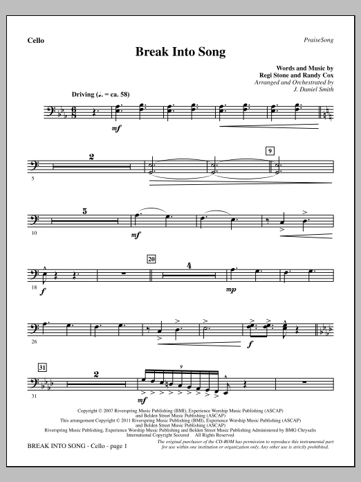 Download or print J. Daniel Smith Break Into Song - Cello sheet music, chords and digital score arranged for Choir Instrumental Pak. This Contemporary score includes 3 page(s).