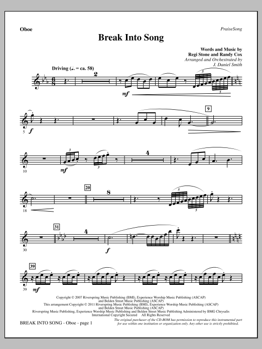 Download or print J. Daniel Smith Break Into Song - Oboe sheet music, chords and digital score arranged for Choir Instrumental Pak. This Contemporary score includes 2 page(s).