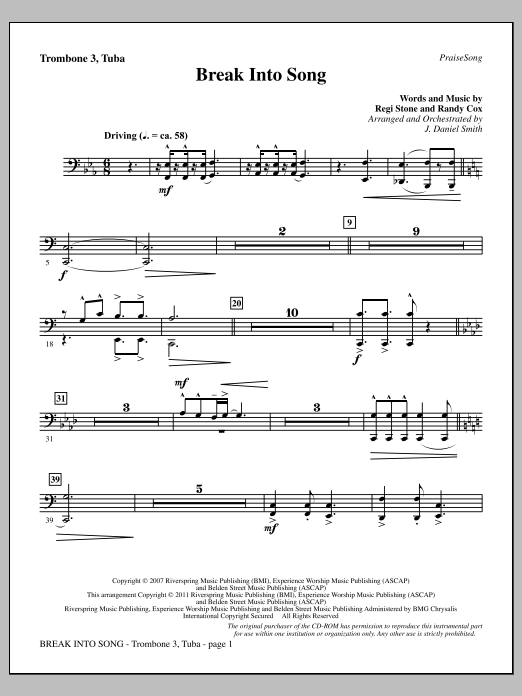 Download or print J. Daniel Smith Break Into Song - Trombone 3/Tuba sheet music, chords and digital score arranged for Choir Instrumental Pak. This Contemporary score includes 2 page(s).