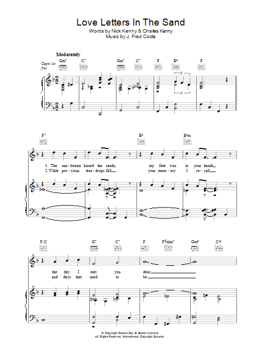 Download or print J. Fred Coots Love Letters In The Sand sheet music, chords and digital score arranged for Piano, Vocal & Guitar Chords. This Pop score includes 5 page(s).