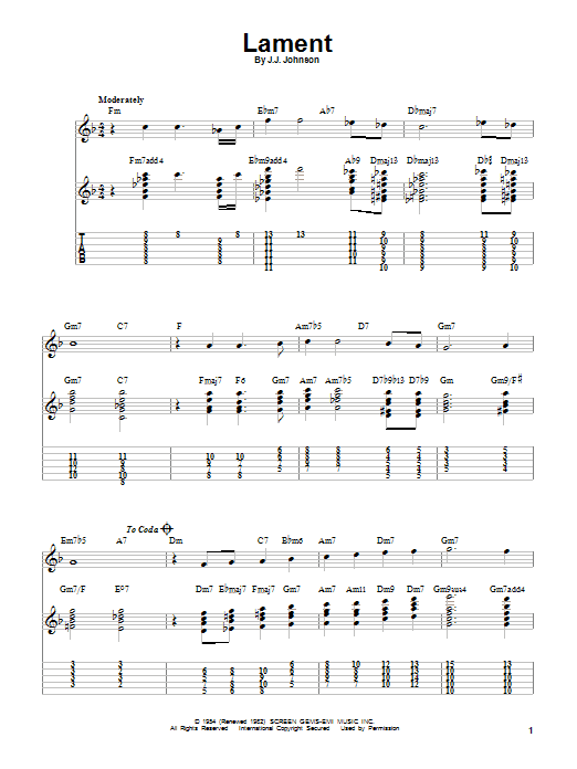Download or print J.J. Johnson Lament sheet music, chords and digital score arranged for Real Book – Melody & Chords – Bass Clef Instruments. This Jazz score includes 1 page(s).