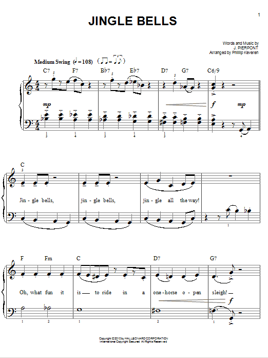 Download or print J. Pierpont Jingle Bells [Jazz version] (arr. Phillip Keveren) sheet music, chords and digital score arranged for Easy Piano. This Children score includes 4 page(s).